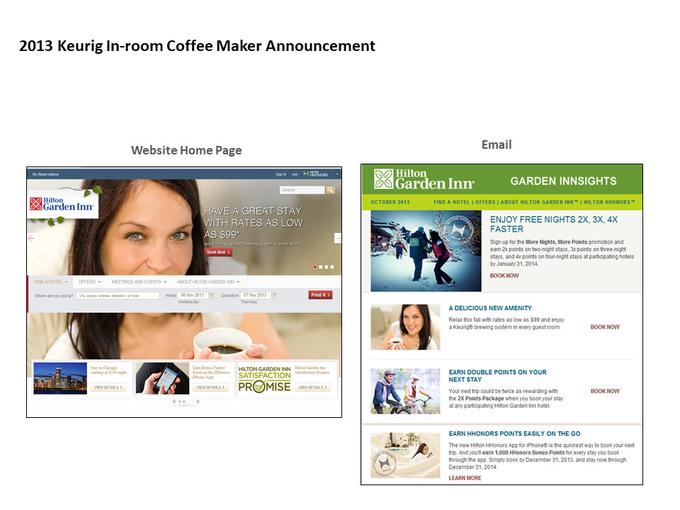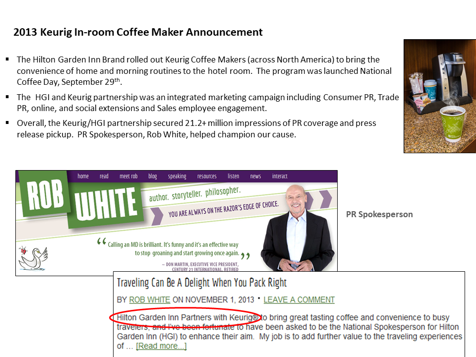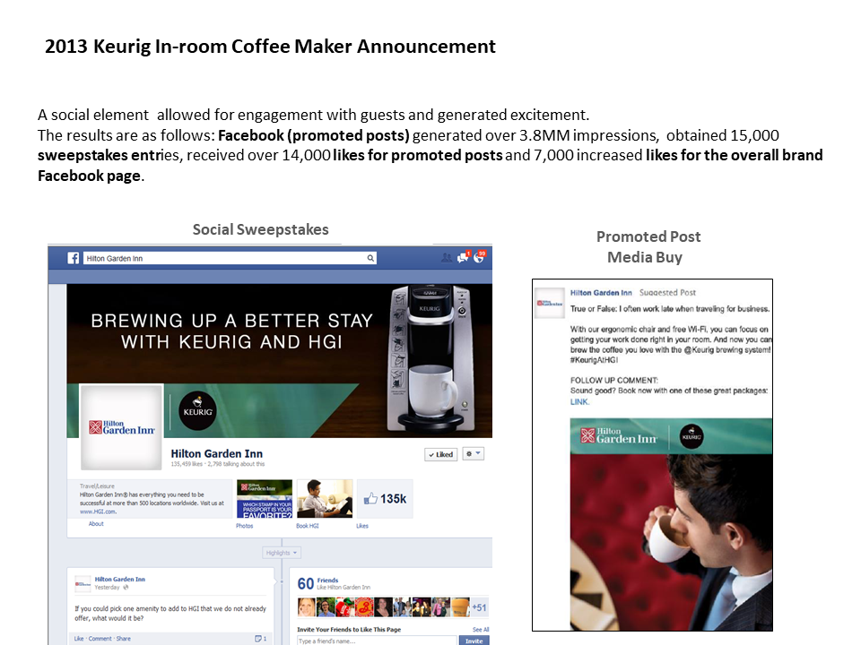 co-branding campaign. Partnered with social media influencer/experts in areas that aligned with the interests of Hilton Garden Inn and Keurig brands audiences. The partnerships drove awareness amongst new audiences and created relevant content that was utilized on the brand website, in an experiential component, in social media channels, on-site customer activations, and through sales.